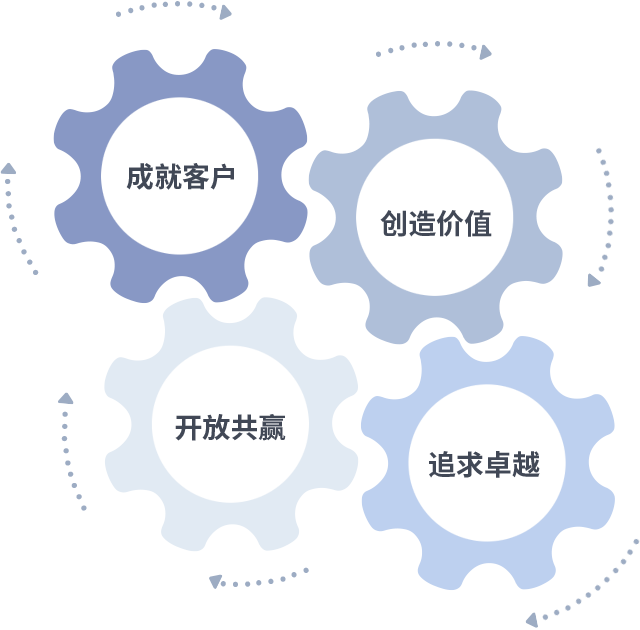 成就客户是一切决策的出发点,,创造价值是衡量所有工作的标准,,,,追求卓越是我们做事做人的态度,,,,开放共赢是我们的格局也是最终的结果。。价值观的齿轮环环相扣,,推动着组织里的每个人不断向前。。。